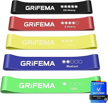GRIFEMA GA5001 Gomas Elásticas Musculación, 5 Niveles de Resistencia, para Yoga, Entrenamientos de Fuerza y Pilates, con Guía de Entrenamiento y Bolsa de Almacenamiento