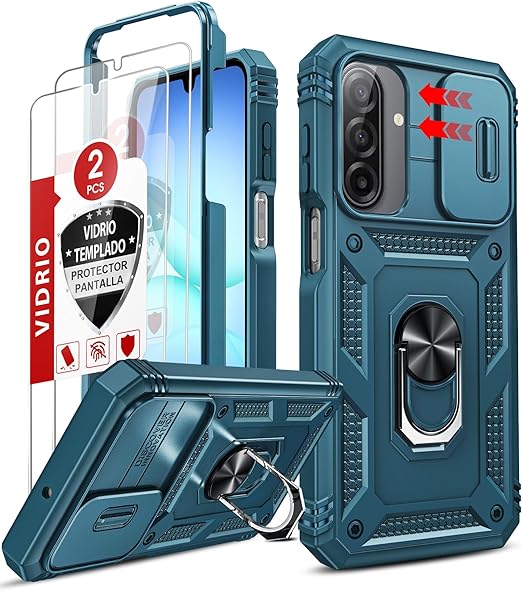 LeYi Funda para Samung Galaxy A17/A 17 5G con [2-Unidades] Cristal Vidrio Templado, Uso Rudo Carcasa Cubierta de cámara Deslizante Proteger Anillo Soporte Silicona TPU Armor Bumper Case, Azul