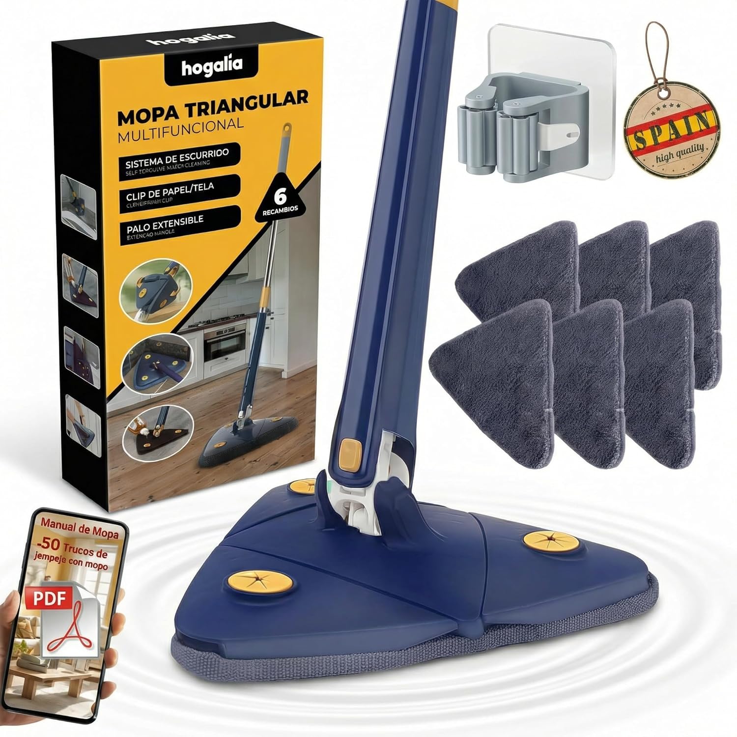 Mopa Triangular Giratoria 360 Autoescurrible de Microfibra, Mopa para Limpiar Azulejos y Paredes, Colgador, 6 Recambios, Manual y Trucos. Fregona…