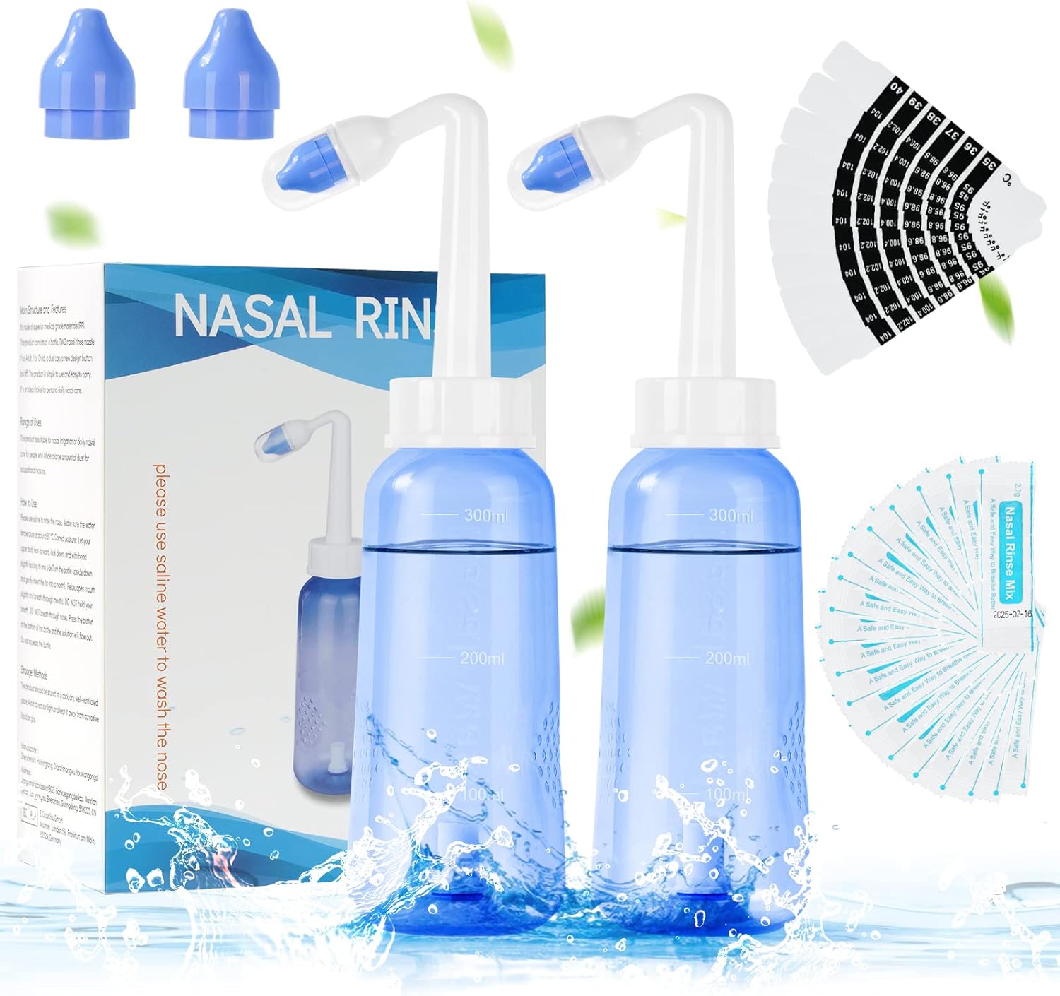 URAQT Lavado Nasal Adulto, 2pcs Irrigador Nasal de 300ml, Neti Pot con Sal Nasal y Termómetro Pegatina, Limpiador Nasal Adulto para Alivio Congestión Nasal