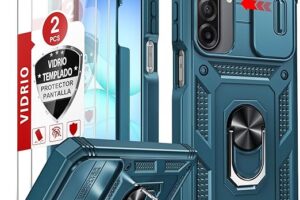 LeYi Funda para Samung Galaxy A17/A 17 5G con [2-Unidades] Cristal Vidrio Templado, Uso Rudo Carcasa Cubierta de cámara Deslizante Proteger Anillo Soporte Silicona TPU Armor Bumper Case, Azul