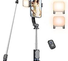 Palo Selfie con Soporte para Teléfono Desmontable, Trípode Extensible para Teléfono de 106 CM con Control Remoto, Soporte Giratorio de 360° para Teléfonos iPhone, Samsung y Android (Negro con Luz)